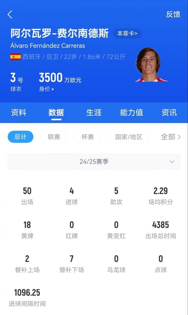 阿尔瓦罗-费尔南德斯,现年22岁,西班牙左后卫,上赛季从曼联以600万欧转会至本菲卡,德转身价3500万欧。